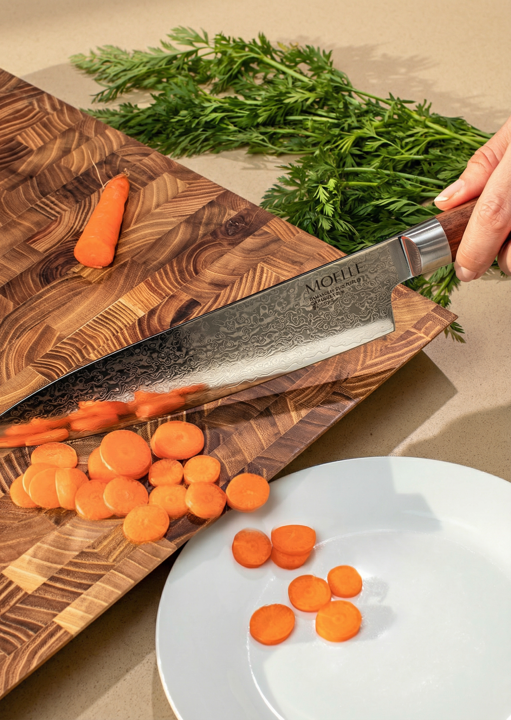 A practical indentation along the edge of the serving-platter side helps gather small pieces so you can work with greater precision, perfect when chopping, for example, nuts or chocolate.