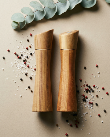 Made from high-quality teak wood, the grinders are durable and pleasant to hold, with a naturally warm appearance. Teak is known for its inherent antibacterial and antifungal properties, as well as its resistance to moisture and odour absorption. These natural qualities contribute to keeping salt and pepper fresh.